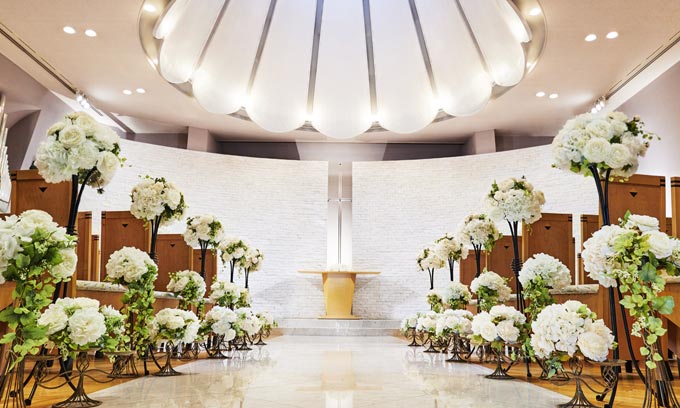 花をモチーフにした天窓から柔らかな光が降り注ぎ、大理石のバージンロードを歩むごとに特別なひとときへの高揚感が高まります。