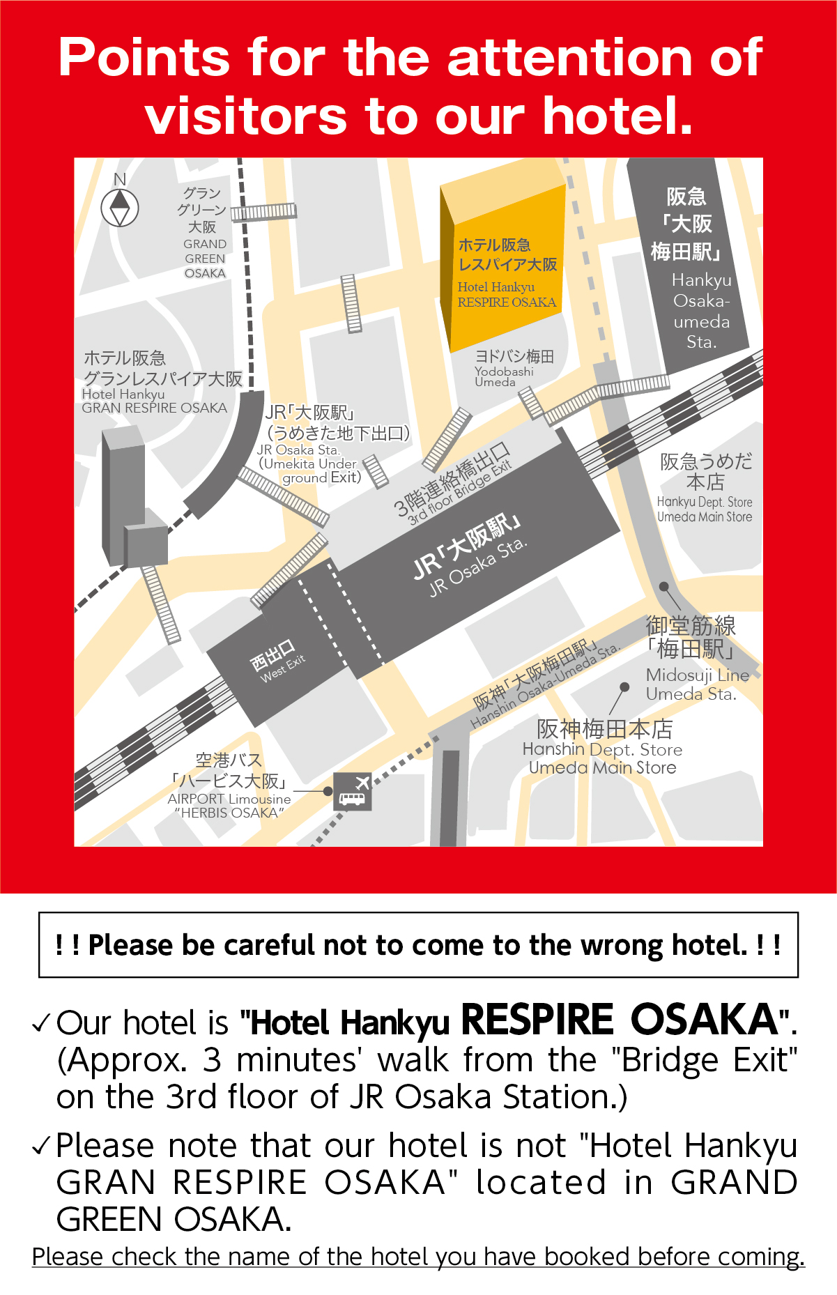 | By Train | ■ About a 3-minute walk from the Bridge Exit on the 3rd floor of JR Osaka Station ■About a 6-minutes’ walk from JR Osaka Station (Umekita Underground Gate)Click here for an access map (PDF view for printing) ■ About a 5-minute walk from Hankyu Osaka-Umeda Station ■ About a 10-minute walk from Hanshin Osaka-Umeda Station ■ About a 5-minute walk from Umeda Station on Osaka Metro Midosuji Line ■ About a 7-minute ride via the JR Kyoto Line or Osaka Metro Midosuji Line from Shin-Osaka Station on Shinkansen Line |