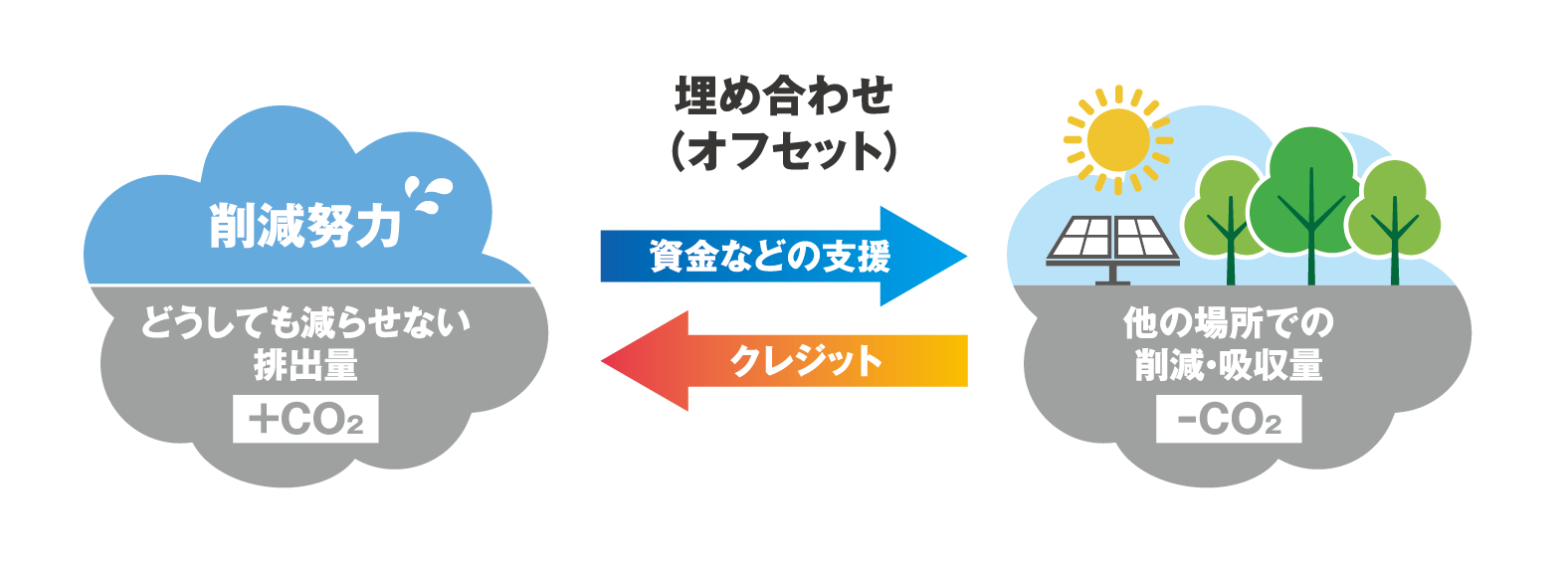日常生活や経済活動において避けることができないCO₂等の温室効果ガスの排出について、まずできるだけ排出量が減るよう削減努力を行い、どうしても排出される温室効果ガスについて、排出量に見合った温室効果ガスの削減活動に投資すること等により、排出される温室効果ガスを埋め合わせるという考え方です。