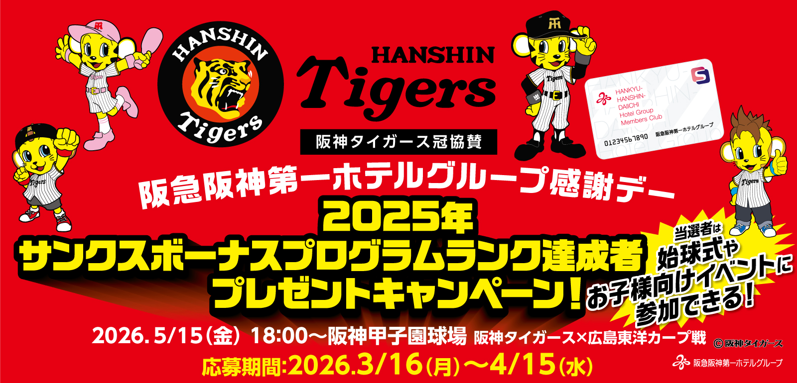 ・当選者のメンバーズクラブ会員様に代わり、ご家族が①始球式、または②イニング間イベントに参加される場合は、予めキャンペーン事務局がご連絡させていただいた際に係までお申し出ください。