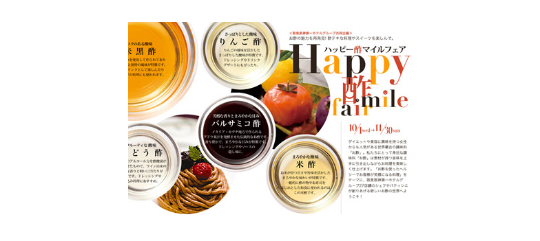 「ハッピー酢マイルフェア」では、株式会社ミツカン様の製品を使用したホテルシェフ考案のお料理やデザートを、フェア期間中各ホテルのレストラン店舗にて販売し大変好評となりました。