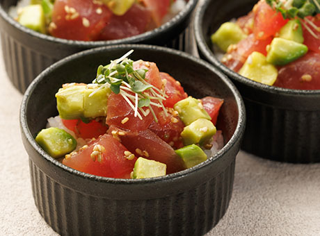胡麻の食感が楽しい酢飯に、炙りサーモンを乗せ、