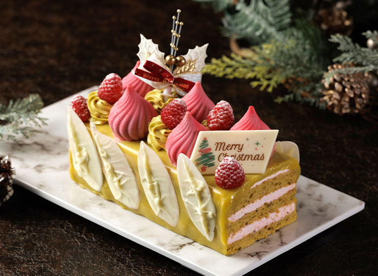 ピスタチオのビスキュイを木苺のバタークリームでサンドしたケーキ。