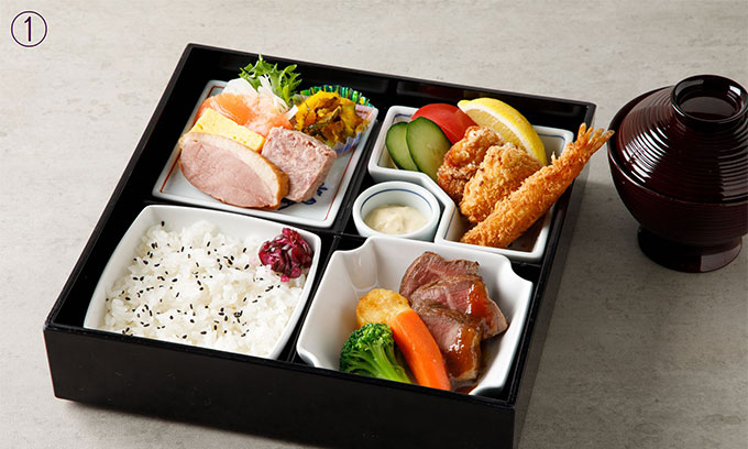 ●弁当 四枡(前菜、揚げ物とサラダ、牛肉のステーキ、御飯)