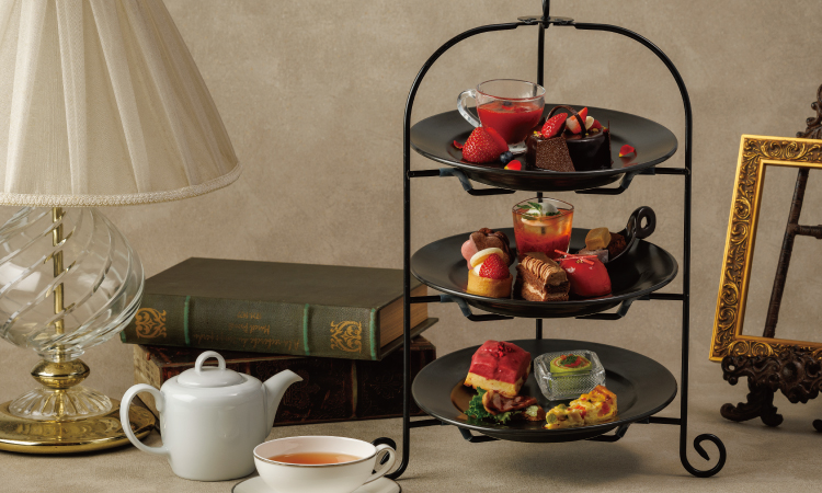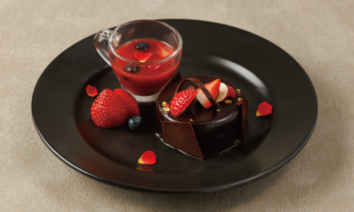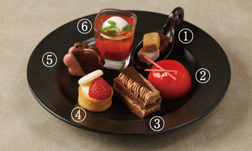 ①3種の生チョコ(ビター、ルビー、ドゥルセ) ②ルビーチョコと苺のムース ③チョコレートケーキ ④ホワイトチョコとチーズのタルト ⑤クッキーサンド ⑥苺のコンポートとシャンパンゼリー