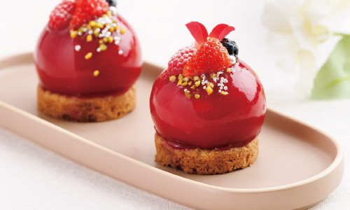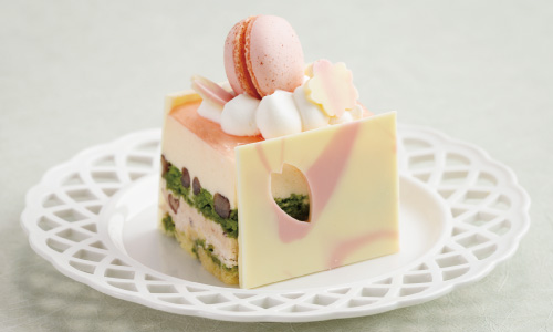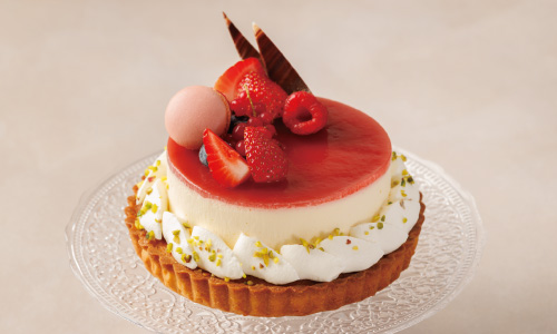 味の異なる二種類のチーズケーキ。ベイクドチーズのタルトの上に苺のジュレと、サクサクのホワイトチョコのロイヤルティーヌが入ったレアチーズケーキを重ねました。