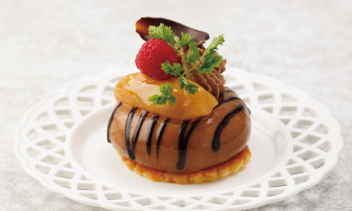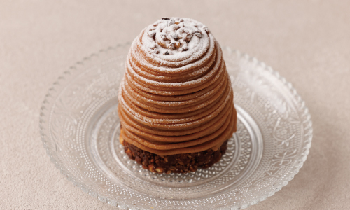 ザクザクとした食感を楽しめるサブレとヘーゼルナッツを合わせたショコラの土台に、ブランデー風味のマロンクリームを搾り仕上げました。