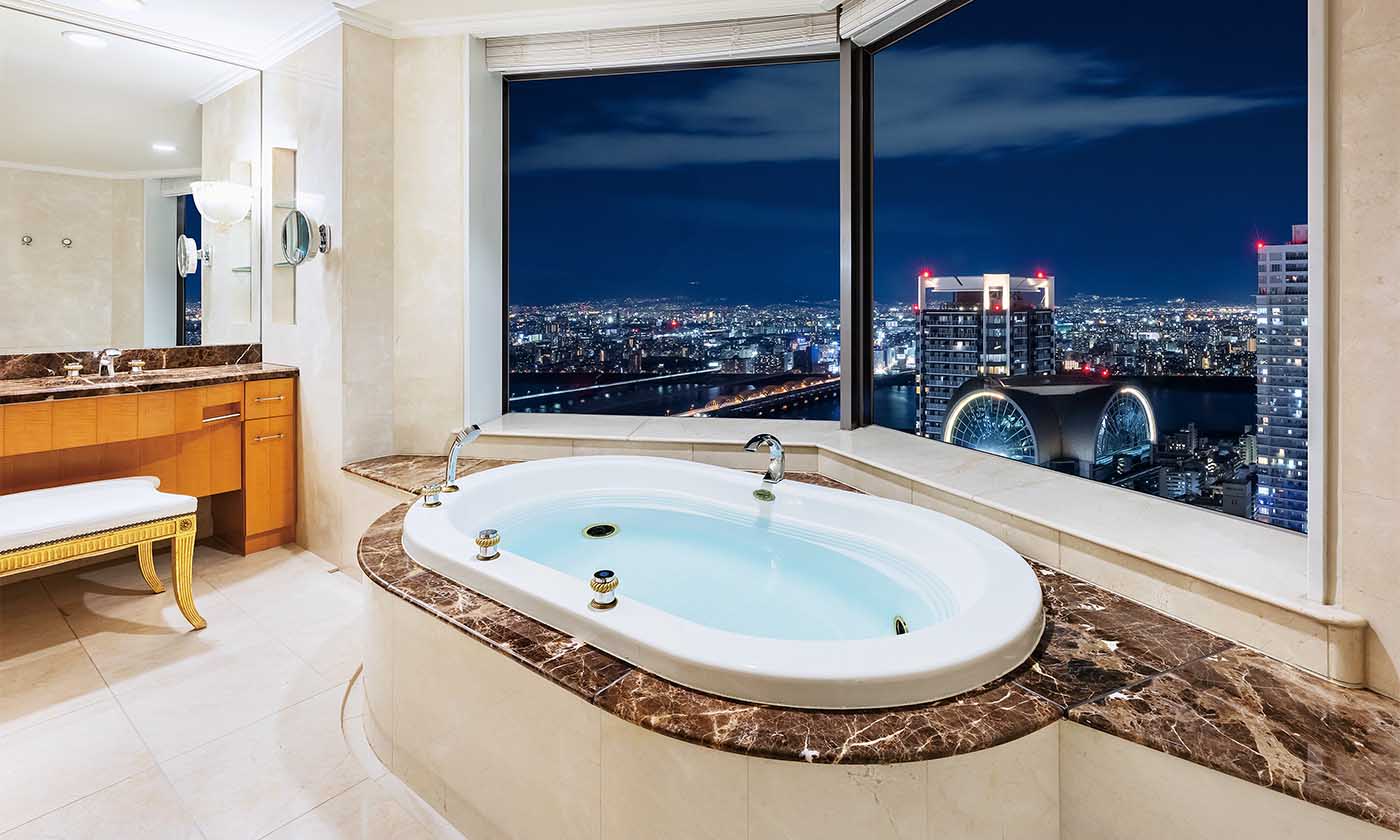 大理石造りのバスルームから景色を一望。ジェットバスや独立したシャワールームを備え、優雅なバスタイムを演出。