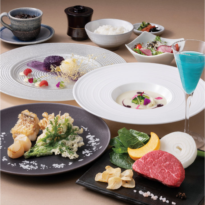 星組の鮮やかなブルーが煌めくドリンクに始まり、花組をイメージした花野菜をあしらったあたたかいスープ、雪組は降りしきる雪を思わせる塩と野菜のフリットを。月組のモチーフをかたどった焼き野菜に、デザートには宙組の紫色のスイートポテトとアイスを添えました。