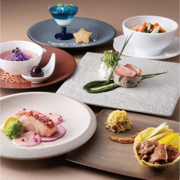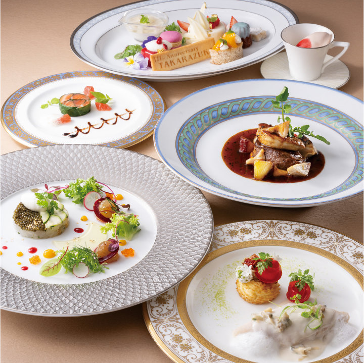 前菜からデザートまでひと皿ごとに5組のモチーフ・カラーをあしらった全6品のコラボレーションコースです。翡翠 ソースで雪組の緑を表現した前菜に始まり、紫蘇のゼリーを溶かしながら味わう宙組のふかひれスープ。花山椒の香りで蒸したサーモンで花組を。金沙で月組のモチーフを表現した肉料理、星組カラーと星のクッキーのデザートで締めくくります。