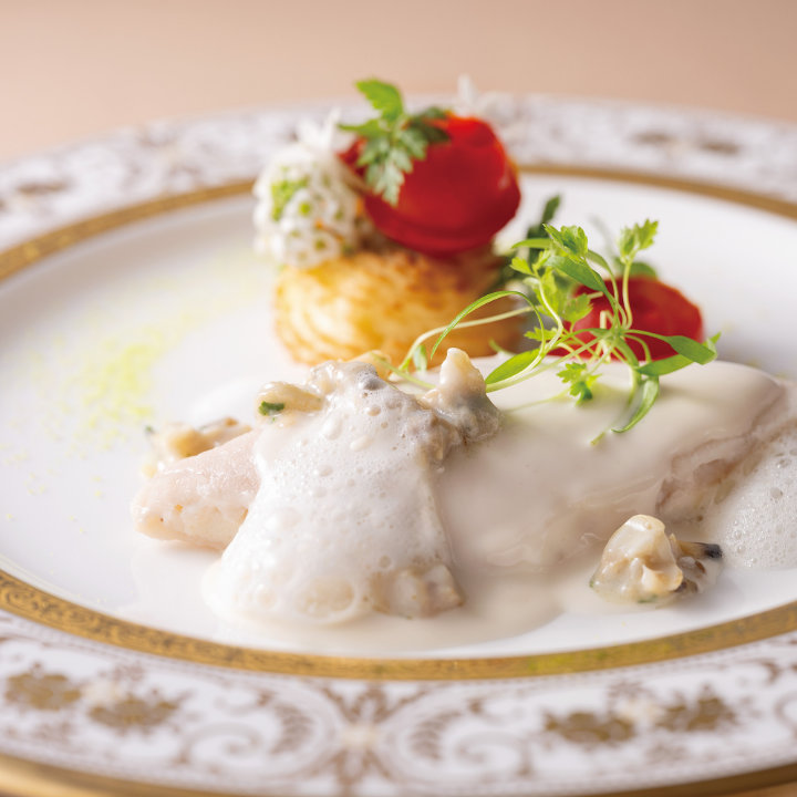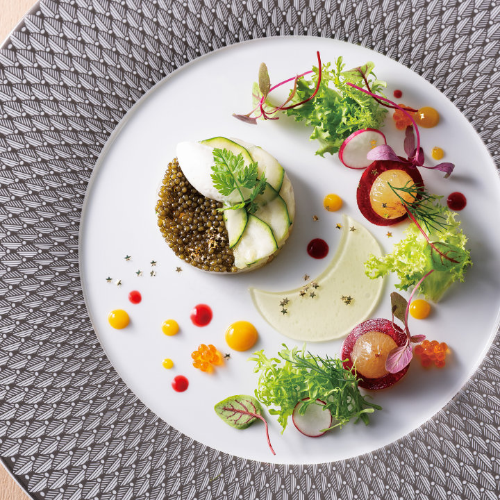 月・星・宙組をひと皿で表現した前菜に、魚料理では泡仕立てのソースで雪組を、野菜で花組をイメージしました。