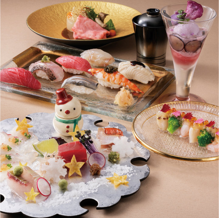 先付には花組を、造りには雪組と星組をイメージしたモチーフをあしらいました。満月のようなお皿に盛りつけた黒毛和牛と月大根で月組を、葡萄など組色を取り入れたパフェで宙組を表現し、宝塚歌劇の世界観を感じていただける全6品をご用意しました。