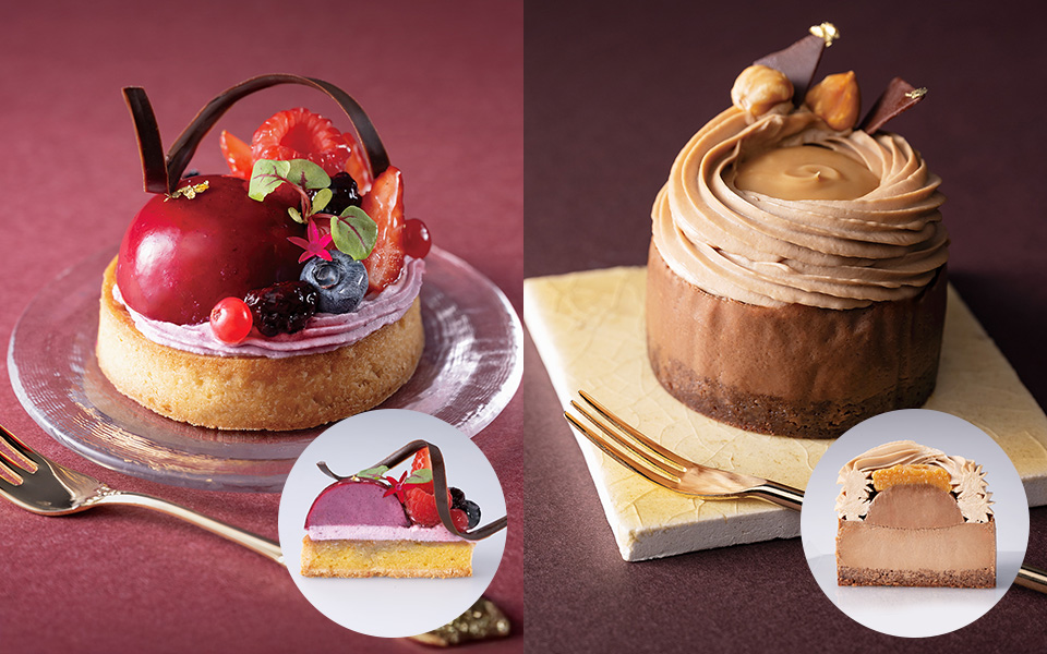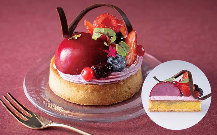 カシスのシロップを染み込ませたアーモンド風味のタルトに、カシスのクリームとムースをのせ、苺やブルーベリーなど数種のベリーを飾りました。