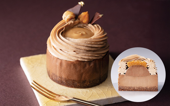 チョコを合わせたベイクドチーズケーキの上にチョコガナッシュをのせ、チョコクリームを絞り、中央にキャラメルソースを流しました。