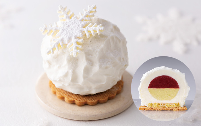 ホワイトチョコとヨーグルトのムースに苺とグロゼイユのジュレとピスタチオブリュレをしのばせました。