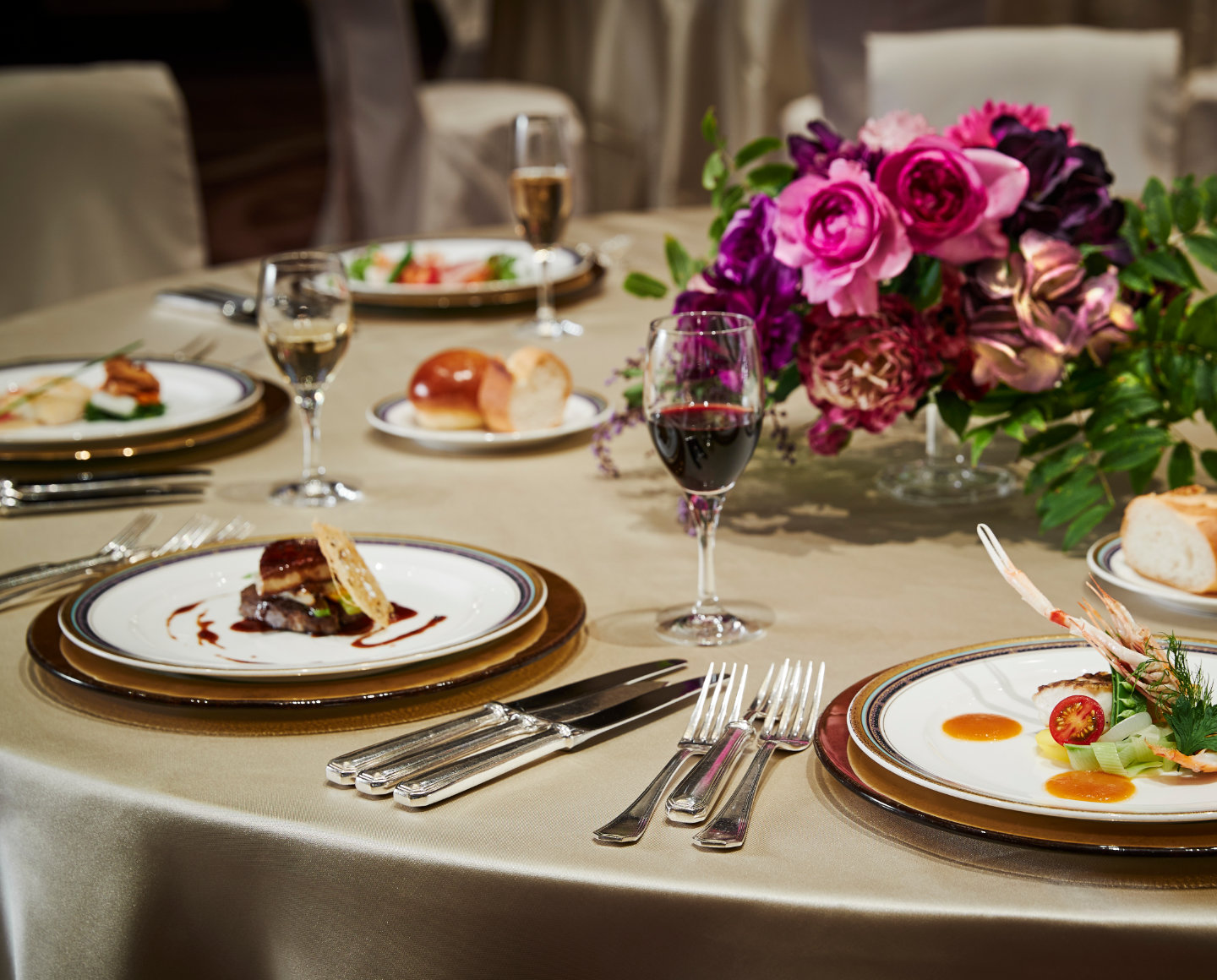 着席形式にて式典を行った後、同一会場もしくは別会場でご懇談いただくスタイルです。お食事会場が同一の場合は正餐形式(コース料理)、別の場合は立食形式(ビュッフェ料理)が一般的です。