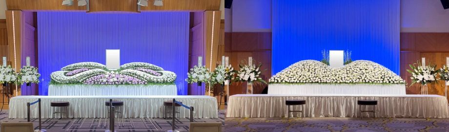 - 表記の料金には、いずれも消費税・サービス料15%が含まれます。(祭壇装花、献花、見附パネル、メモリアルパネル、略歴パネルはサービス料をいただいておりません。)