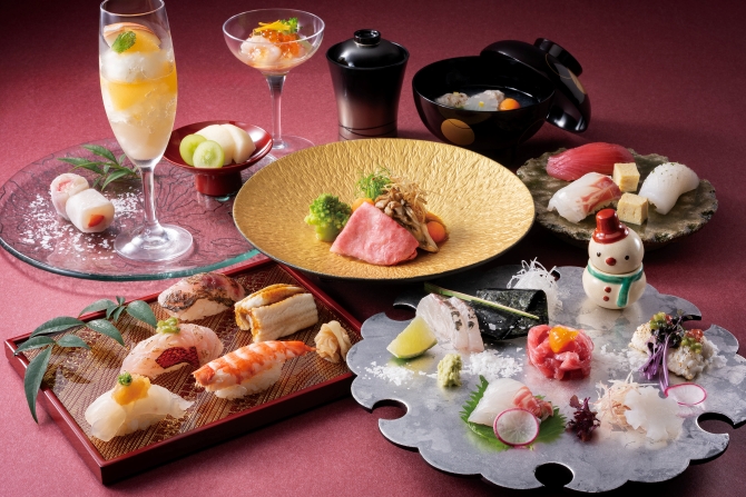 ・クリスマスデザート:林檎と柚子のパフェ 苺大福ロール 果物2種
