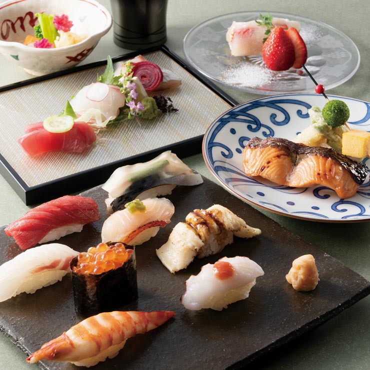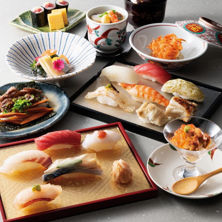 先付/おまかせにぎり12貫/茶碗蒸し/黒毛和牛手巻き寿司/天ちらし/とろたく細巻き3貫/赤出汁