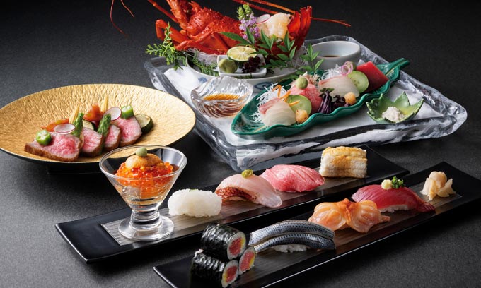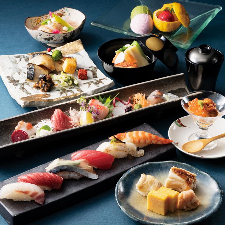 前菜5種/椀物/造り:伊勢海老 他2種盛り合わせ/焼物:黒毛和牛のひと品/にぎり寿司8貫/細巻き3貫/伊勢海老の赤出汁/デザート:季節の果物とアイス