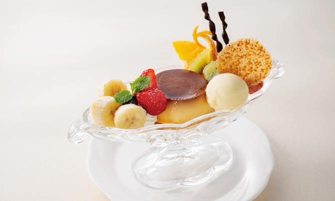 固めプリンとバニラアイス、フルーツ、チュイール、チョコを豪華に盛り合わせました。