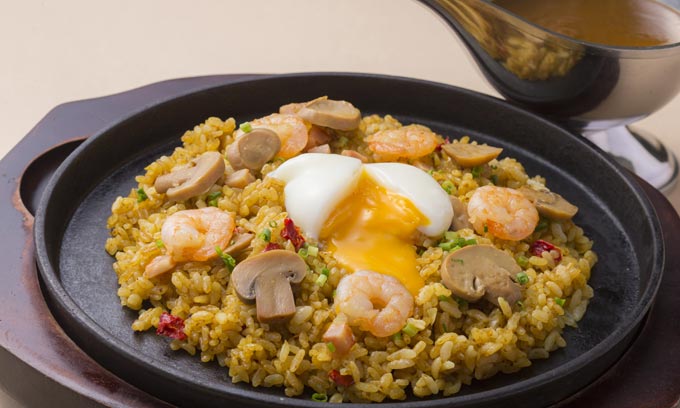 海老やマッシュルームを入れ、スパイスを利かせたドライカレーは、