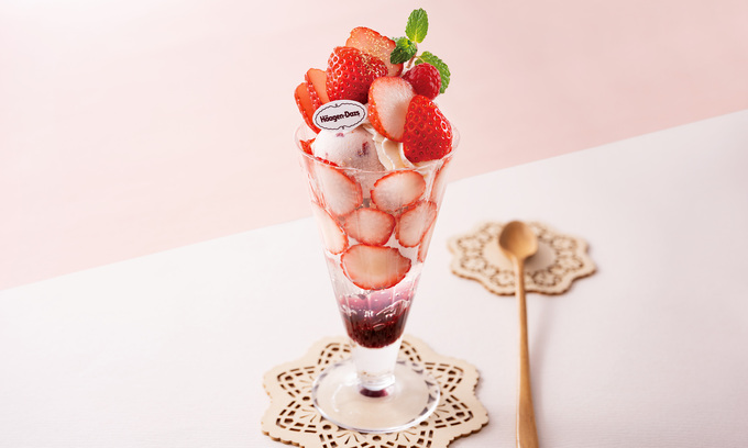 口の中でとろける濃厚なハーゲンダッツ ストロベリーアイスクリームに、苺の甘酸っぱさがマッチ。 サクサクとした食感のクランチチョコがアクセントです。 ベリーソースとレモンジュレの上に、ホイップクリームとクランチチョコ、ハーゲンダッツ ストロベリーアイスクリームを重ね、トップには苺とフランボワーズを盛り付けました。