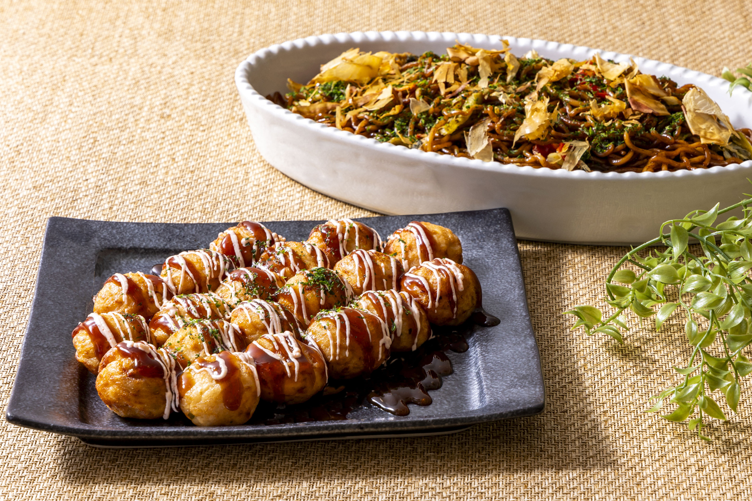 ・温製料理(焼きそば、たこ焼き、鶏のからあげ、一口餃子の自家製ラー油風味、蒲刈の藻塩と青海苔風味の小鰯のフリット、フライドポテト)