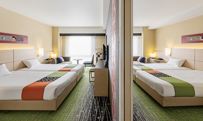 京唐紙、西陣織写しの帯柄を使用し「古都・京都」感を演出した客室をはじめ多彩なゲストルームをご用意しております。