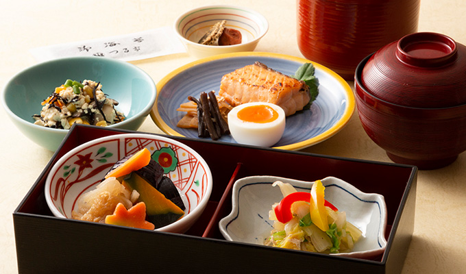 名店「つる家」の味を朝食でもお召し上がりいただけます。お粥は奈良県吉野の本葛を使用したつる家伝統のあん掛け粥です。ぜひご賞味ください。