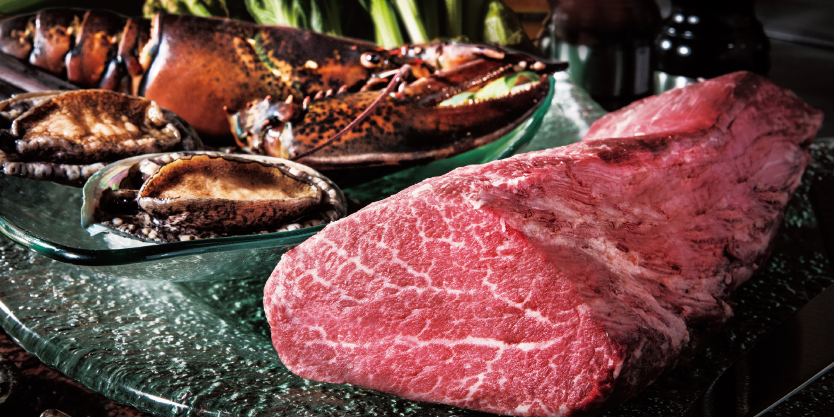 極上黒毛和牛フィレに加え、活オマール海老や活蝦夷鮑(エゾアワビ)など豪華食材を鉄板焼で堪能する贅沢コース。