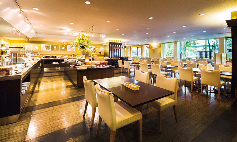 大きな窓からやわらかい光が降り注ぐ開放感あふれるレストラン。季節ごとに変わる和洋の料理とデザートメニューをお好きなだけお楽しみいただけます。