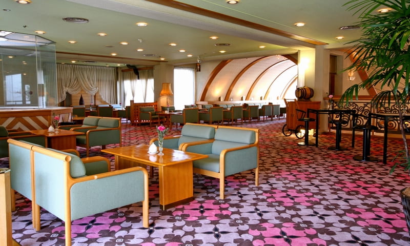 ホテルのメインラウンジ。ゆったりくつろげるソファ席のある店内は、お食事の後や商談に最適のスペースです。さくららうんじに面した中庭は、昼間は季節の美しい花々を、夕方はライトアップされた大人の雰囲気をお楽しみいただけます。