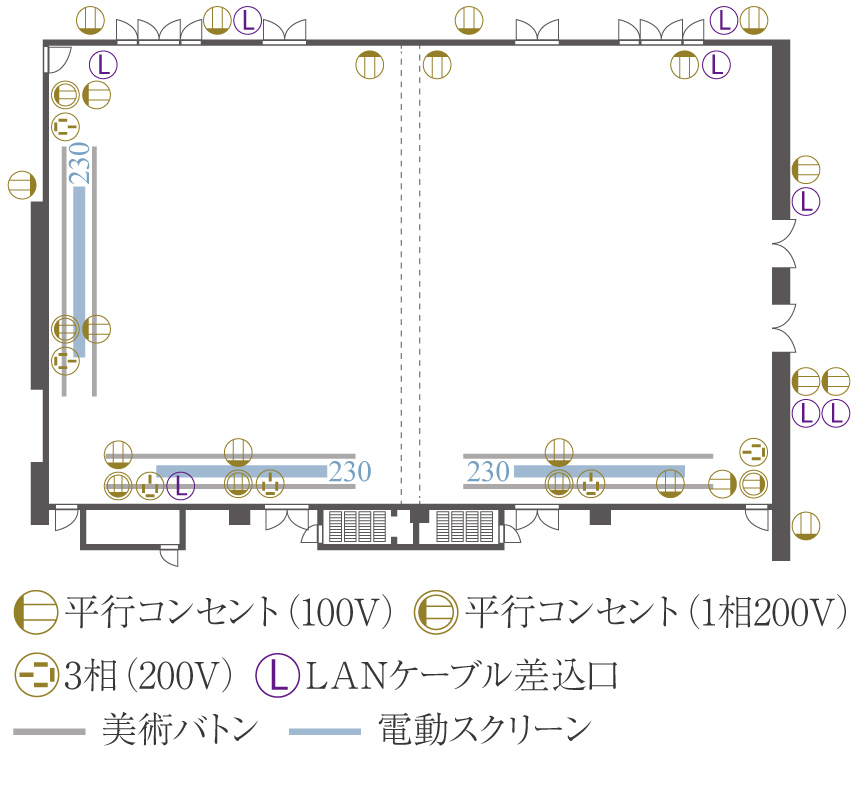 | 面積(m2) | 坪(坪) | 高さ(m) | 正餐(名) | 立食(名) | スクール(名) | シアター(名) | |