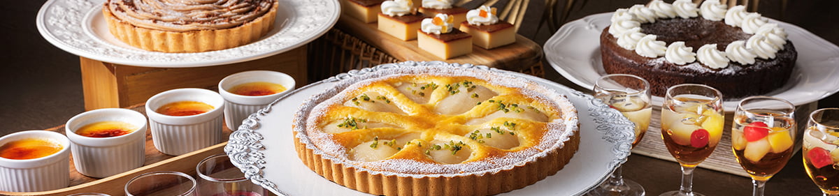 シェフ渾身のひと皿「フルーツジュピレ バニラアイス添え」をはじめ、洋梨のタルトやドーム・オ・ショコラなど