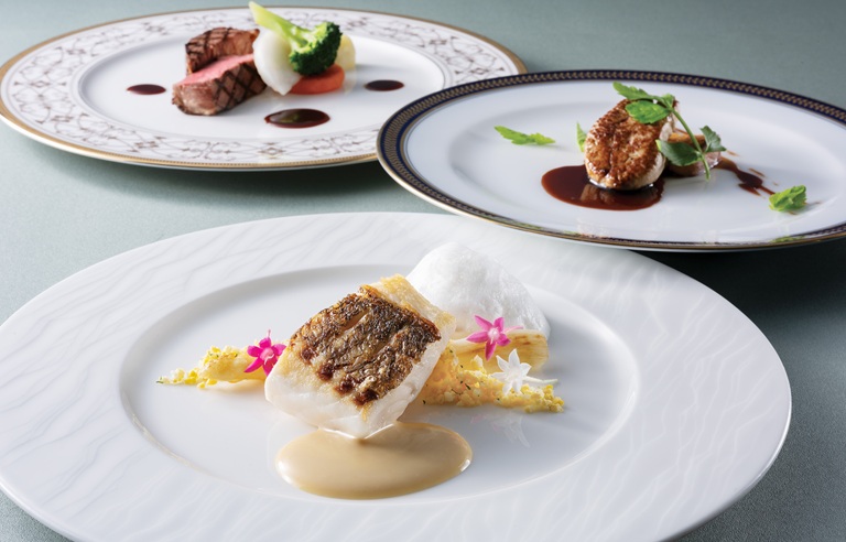 新玉葱のポタージュと白魚のフリットなど、春の味覚を繊細に表現しました。