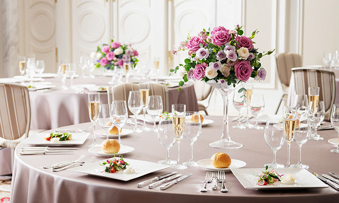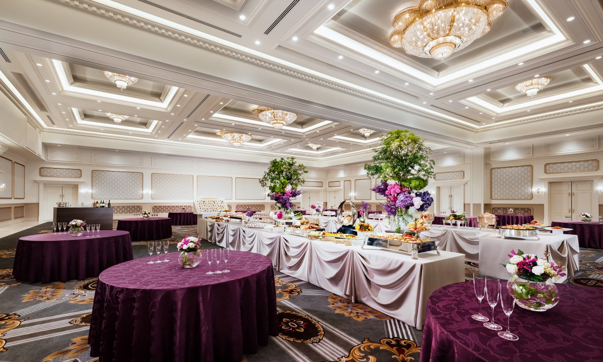 クラシックな落ち着きとエレガントな輝きが融合したラグジュアリーな4つの宴会場はそのすべてに華麗なシャンデリアを配し、最大6.5mの天井高を誇る開放感のある空間に設えました。宴会のスペシャリストが料理、装花、音響、照明など様々な演出からサポートし、1,000名様規模のパーティーから少人数の集まりまで多目的なニーズにお応えいたします。