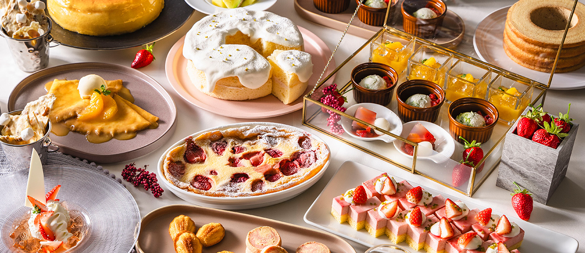 目の前で仕上げるライブデザートや、苺や桃、オレンジなど
