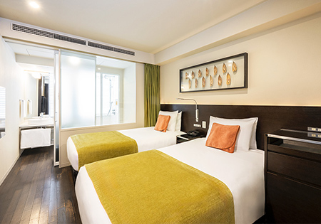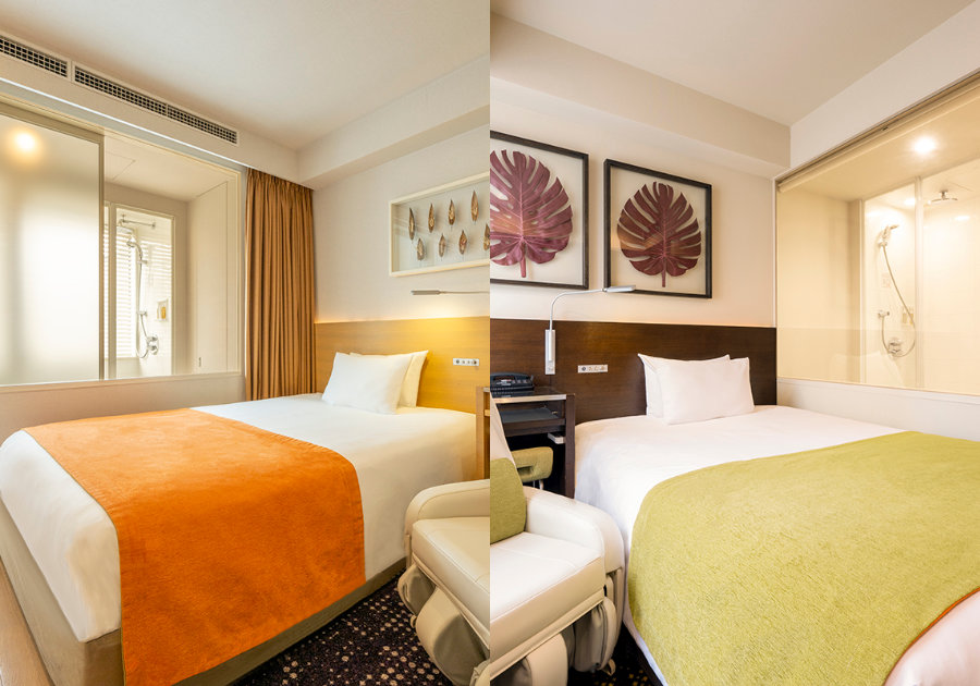 客室カラーは2種類。階数ごとの部屋のアクセントカラーとして心を開放させるオレンジとリラックス効果の高いグリーンを用いております。