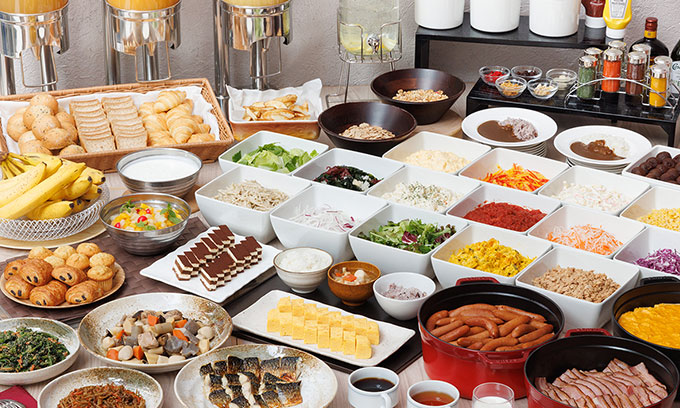フルーツや新鮮な野菜はもちろん、和のお惣菜から定番の卵料理、ソーセージ、ベーコン、など、アイテム数は60種類以上。何度利用しても楽しめる、とっておきの<ホテルの朝ごはん>です。
