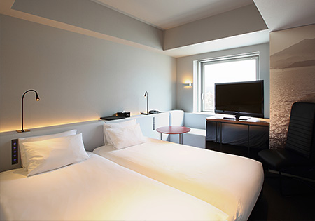 日本ベッド製造(株)と共同開発したオリジナルベッド。通常の倍の数のスプリングを使った超高密度構造。場所によって3箇所硬さを変えているため、身体のラインに沿って包み込まれるような寝心地を体験いただけます。