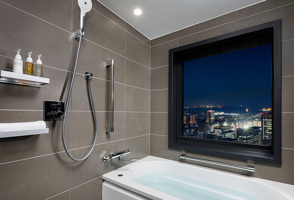 大きなシャワーヘッドから降り注ぐ水流が、からだ全体を優しく包み込みます。ダブルルームではウォームピラーを導入。体に沿って流れる湯に柔らかく包み込まれるような浴び心地をお楽しみください。