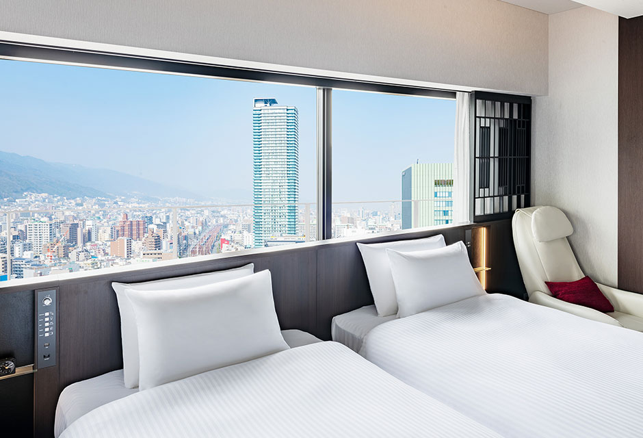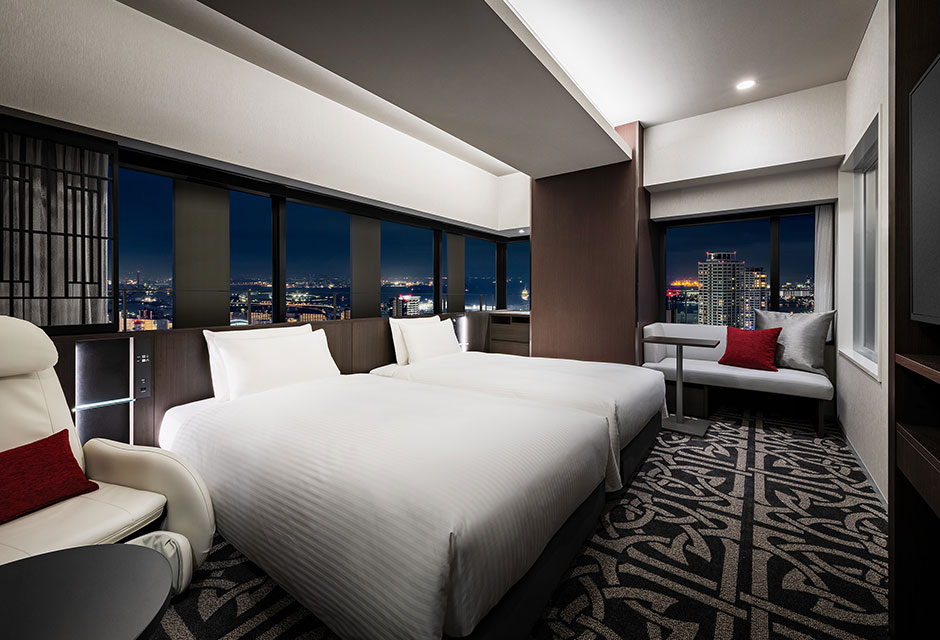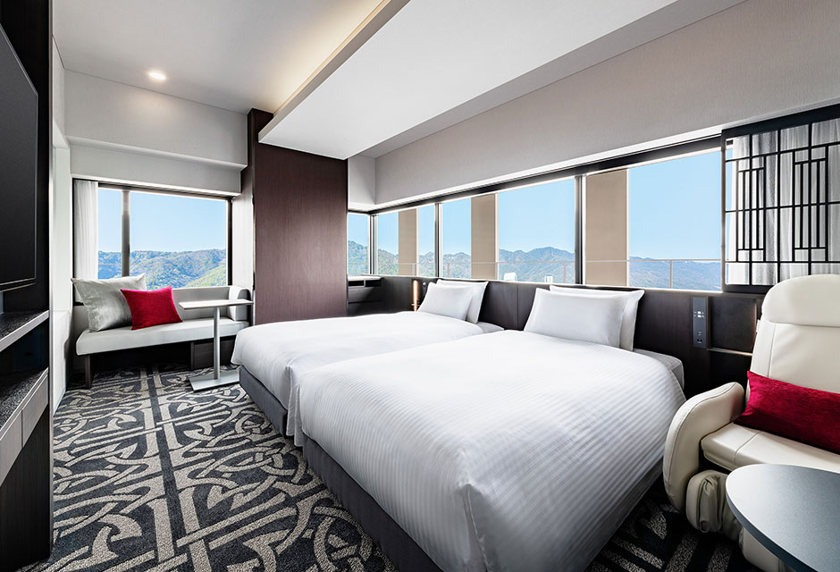 大きなシャワーヘッドから降り注ぐ水流が、からだ全体を優しく包み込みます。ダブルルームではウォームピラーを導入。体に沿って流れる湯に柔らかく包み込まれるような浴び心地をお楽しみください。