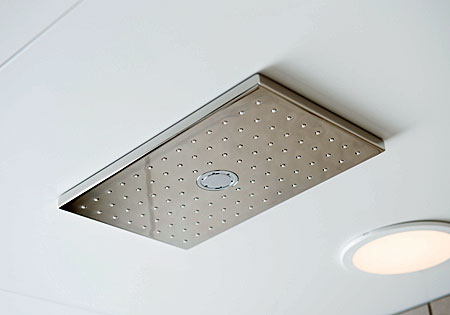 大きなシャワーヘッドから降り注ぐ水流が、からだ全体を包み込んでくれます。ゆったりとスツールに座ってお楽しみください。