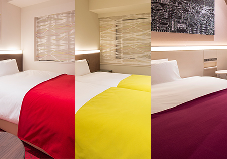 客室カラーは3種類。「夜明け」「暁」をテーマとした“Aube オーブ”、「落日」「夕焼け」をテーマとした“Soleíl ソレイユ”、皇居の森をテーマとした“Forét フォレ”をご用意しています。