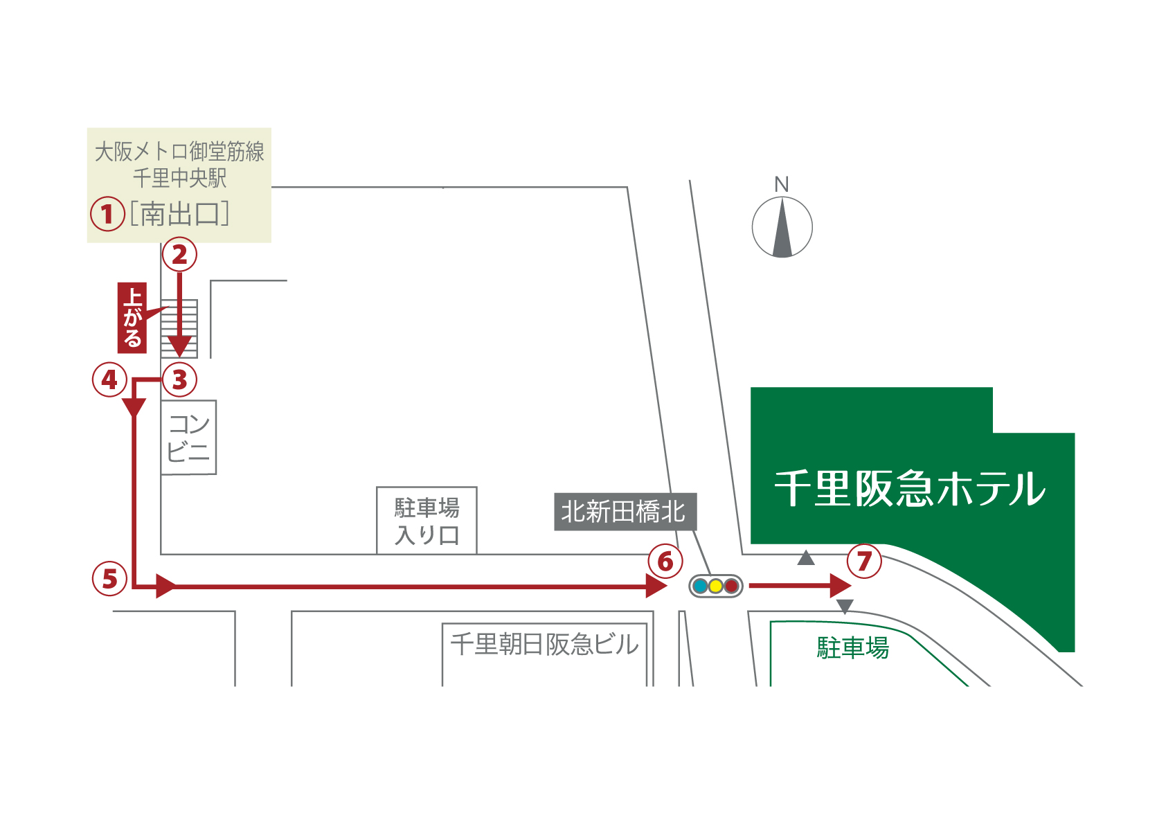 ●大阪メトロ御堂筋線 北大阪急行 千里中央駅下車(梅田駅からは最後尾の車両へお乗りください)