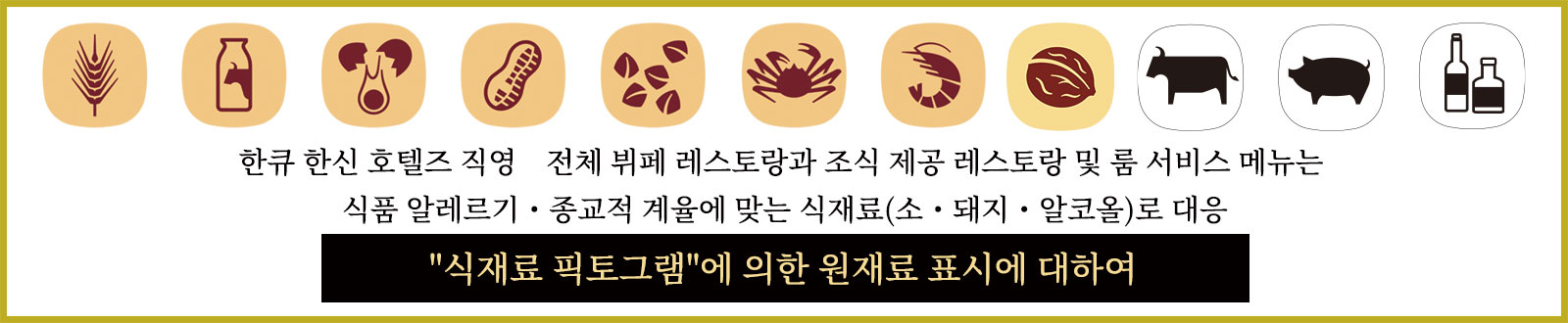 주식회사 한큐 한신 호텔즈 직영 호텔의 전체 뷔페 레스토랑과 조식 제공 레스토랑 및 룸 서비스 메뉴는, "식재료 픽토그램(그림 문자)"으로 8개 종류의 알레르기 특정 원재료 및 종교적 계율상 금기 식재료인 돼지고기, 소고기, 알코올 등 총 11개 종류의 원재료를 표시하였습니다.