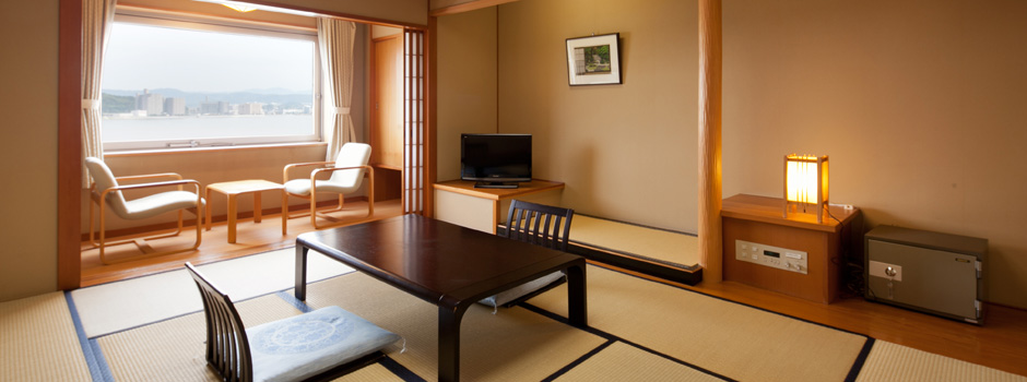 Located within Matsue City and overlooking Lake Shinji-ko, our hotel offers magnificent views from our Japanese-style rooms and scenic onsen bathhouse. Please enjoy the picturesque beauty of Lake Shinji-ko, as Yomegashima Island floats upon its surface and it is framed by the ridges of Chugoku’s mountains, including the beautiful Mount Daisen.