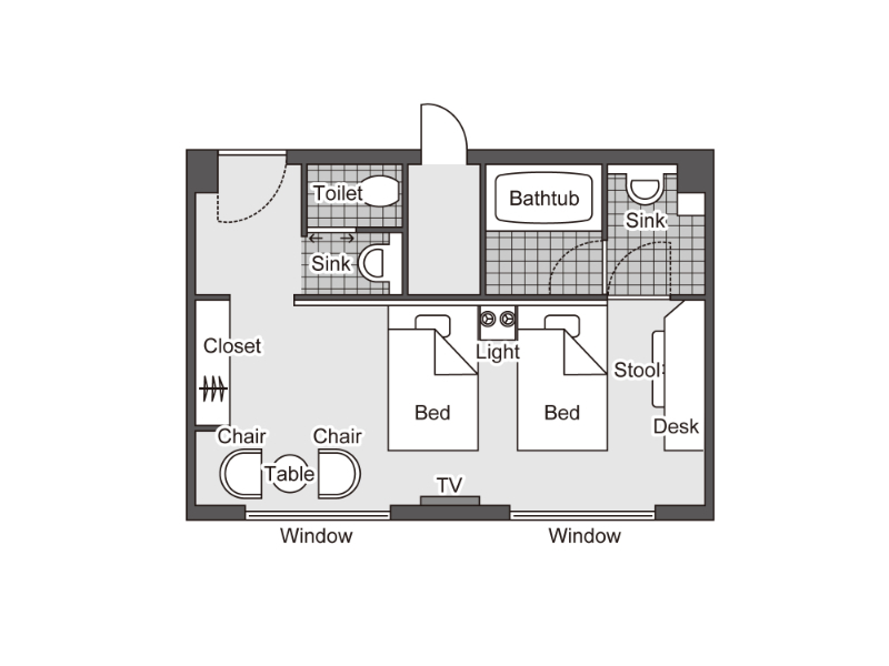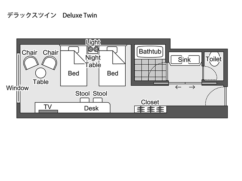 Bed size: 폭 110 × 길이 195 cm 2 대 / 폭 100 × 길이 185 cm 1 대 (엑스트라 베드)