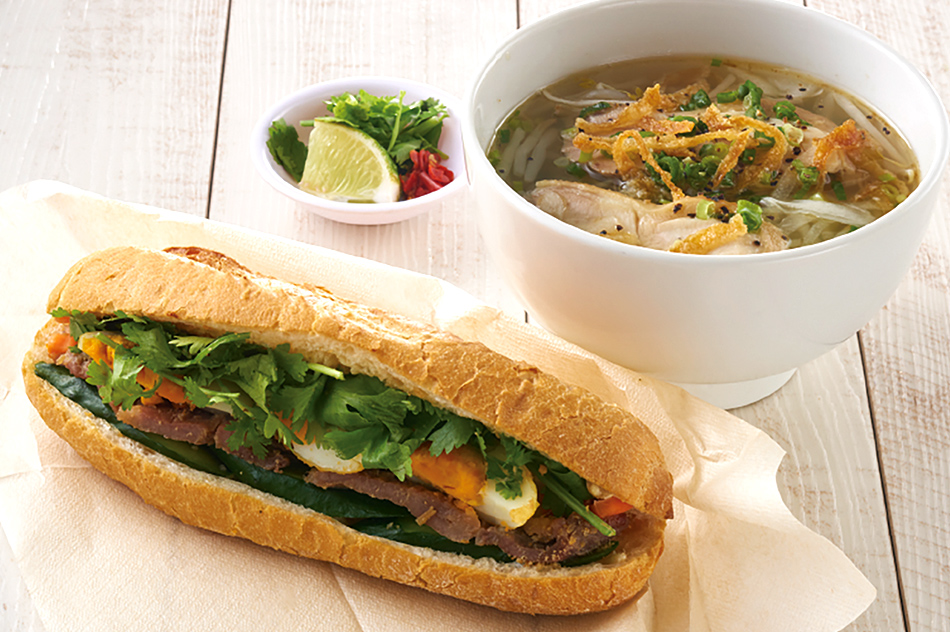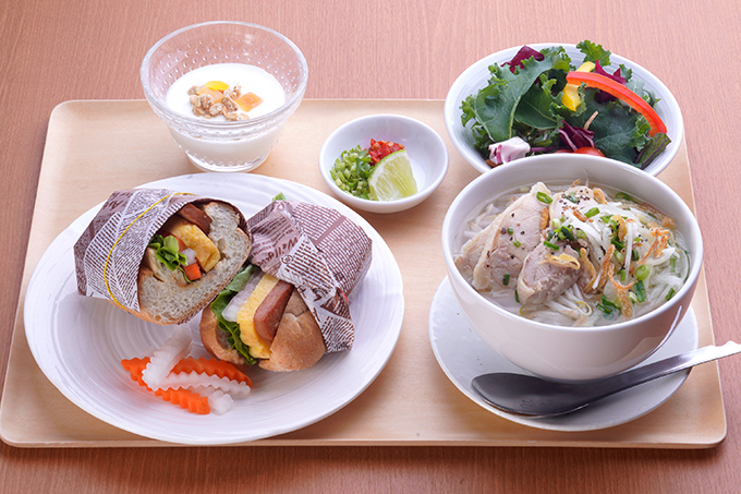 베트나미즈 샌드위치 ‘반미’는 겉은 바삭바삭하고 속은 촉촉해서 깜짝 놀랄 정도로 식감이 가벼운 것이 특징. 베스트셀러인 레몬그라스 치킨이나 베트남 오믈렛 등을 속 재료로 해서 요일마다 다르게 제공합니다. 가볍고 부드러운 맛의 쌀국수도 더해져서 아침부터 베트남식을 만끽하실 수 있습니다.